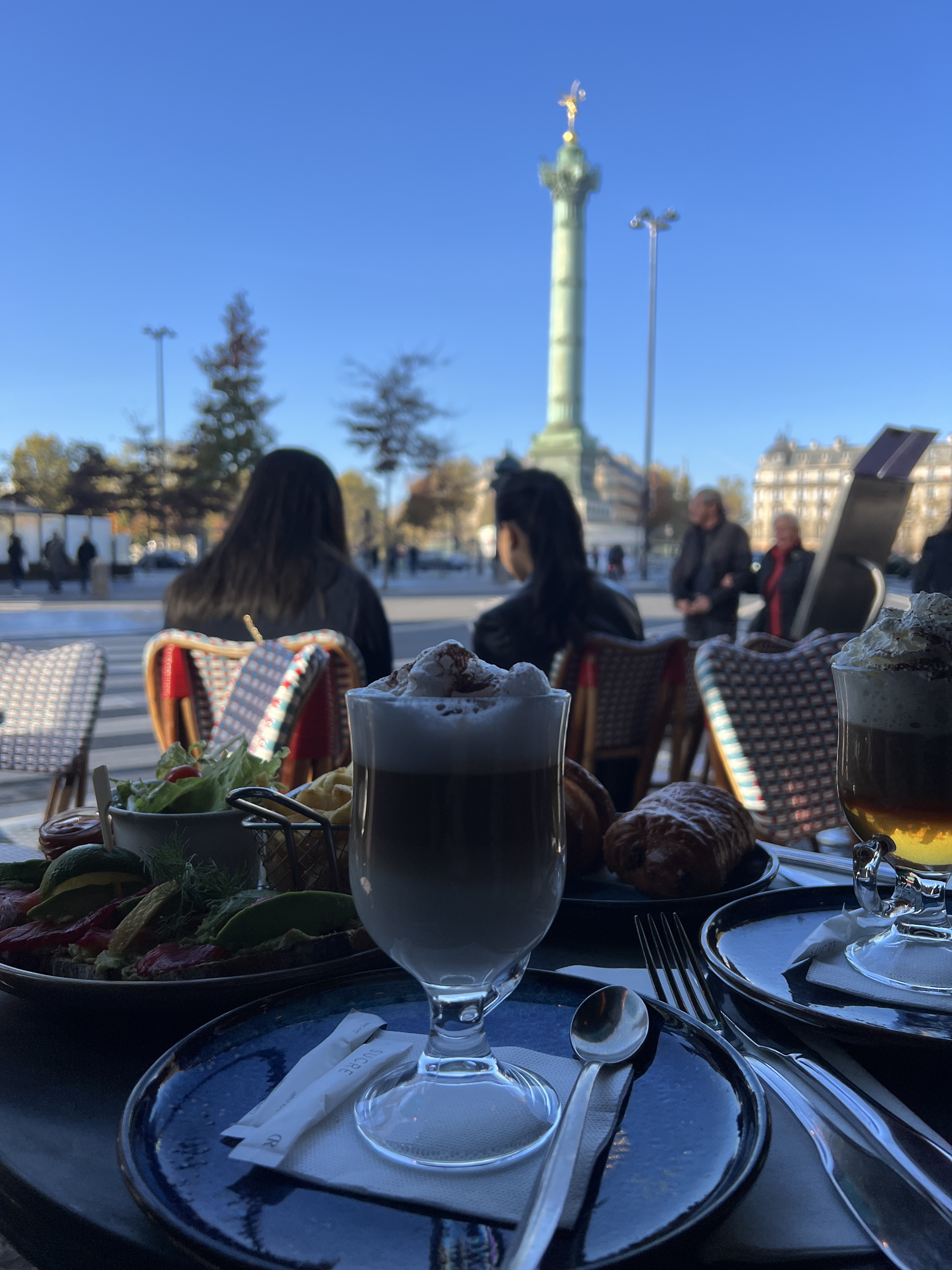 Starting strong with a slow, peaceful morning – we arrive around 8am with a few hours to spare before we are able to check into our Airbnb. We walk around our area to get a good sense of what’s around, and then find ourselves cozy at a cafe right across from the Place de Bastille. The food and the coffee was just as delicious as the view.