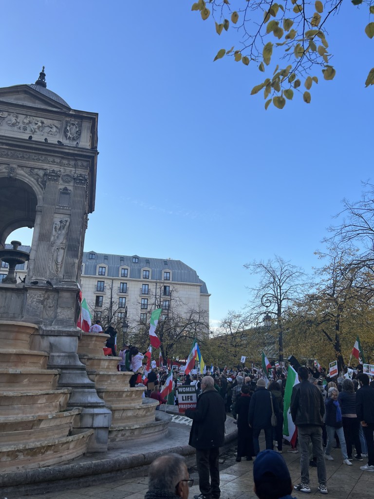 At some point we decide we needed a snack, so we start heading towards an area on the map that looked promising. Along the way there were cute little book nooks implemented into the sidewalk, there were random characters painted on the buildings throughout the city, and there was a passionate protest for the freedom of Iran, which we stayed at for awhile until a family next to us started feeding the birds and it became a pigeon-pocolyps.