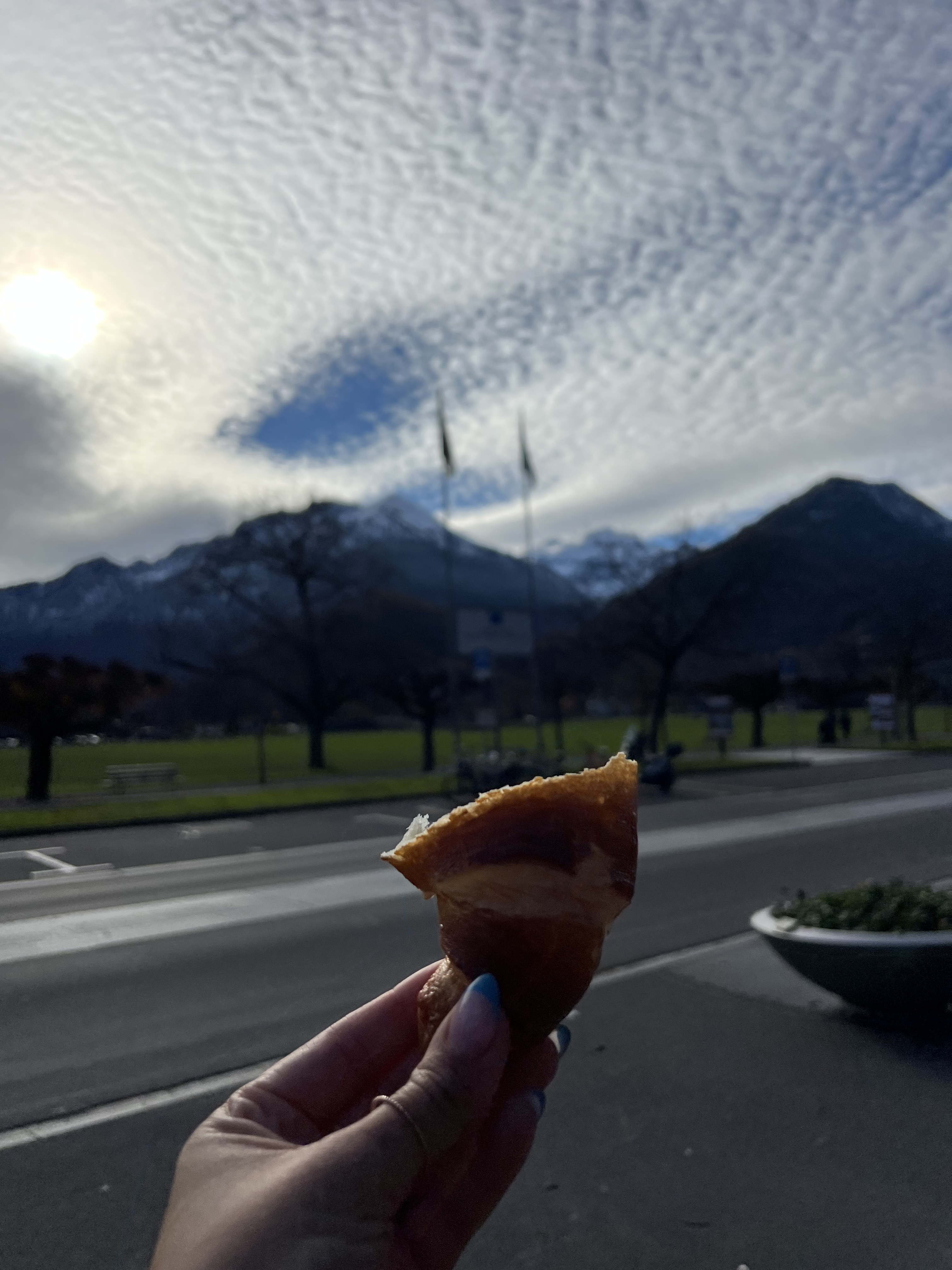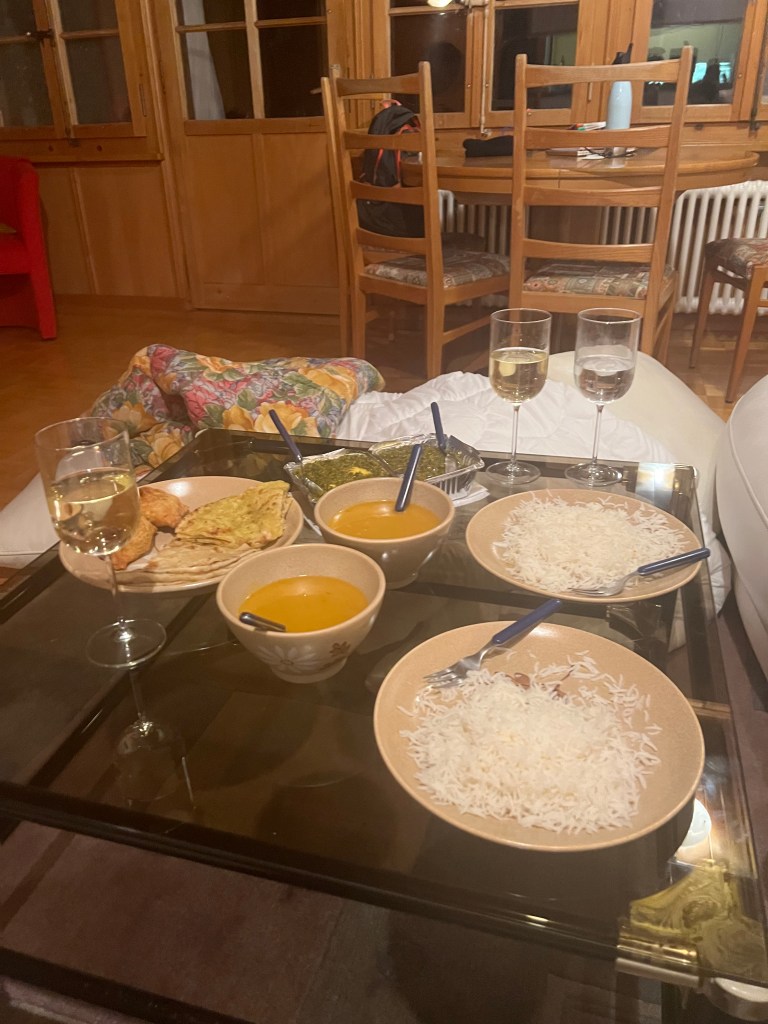 It’s our second to last day before we leave the Interlaken area and we both agreed we wanted to spend some good quality time in our Airbnb since it held such rejuvenating energy, plus the view. We had a slumber party on the couch so we could wake up to the mountains greeting us with the sunrise the next morning. We kept things slow and relaxing, binging more Survivor that morning. Then we spent the rest of the day reading, writing, stretching, reminiscing on the trip thus far – and sharing lots of laughs. We decided to keep things on the lazier side that evening and went into town to pick up more wine and some delicious Indian food for take out.