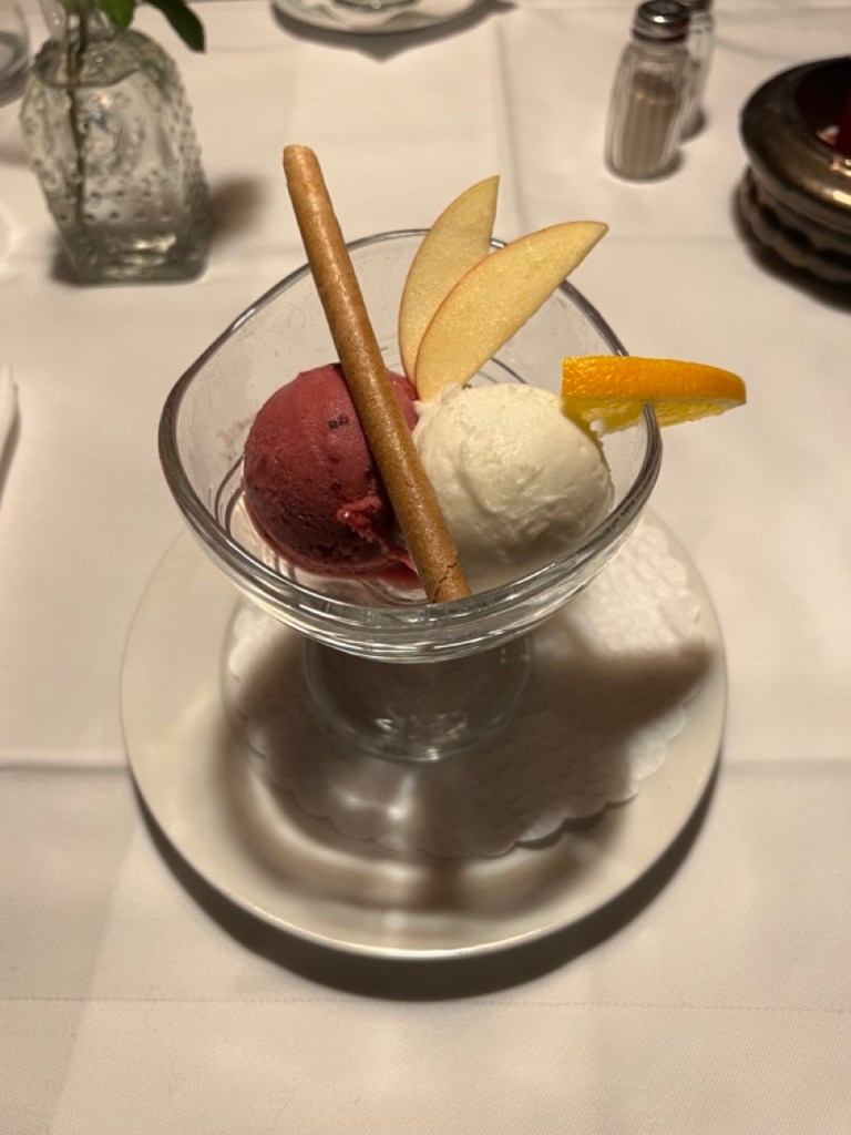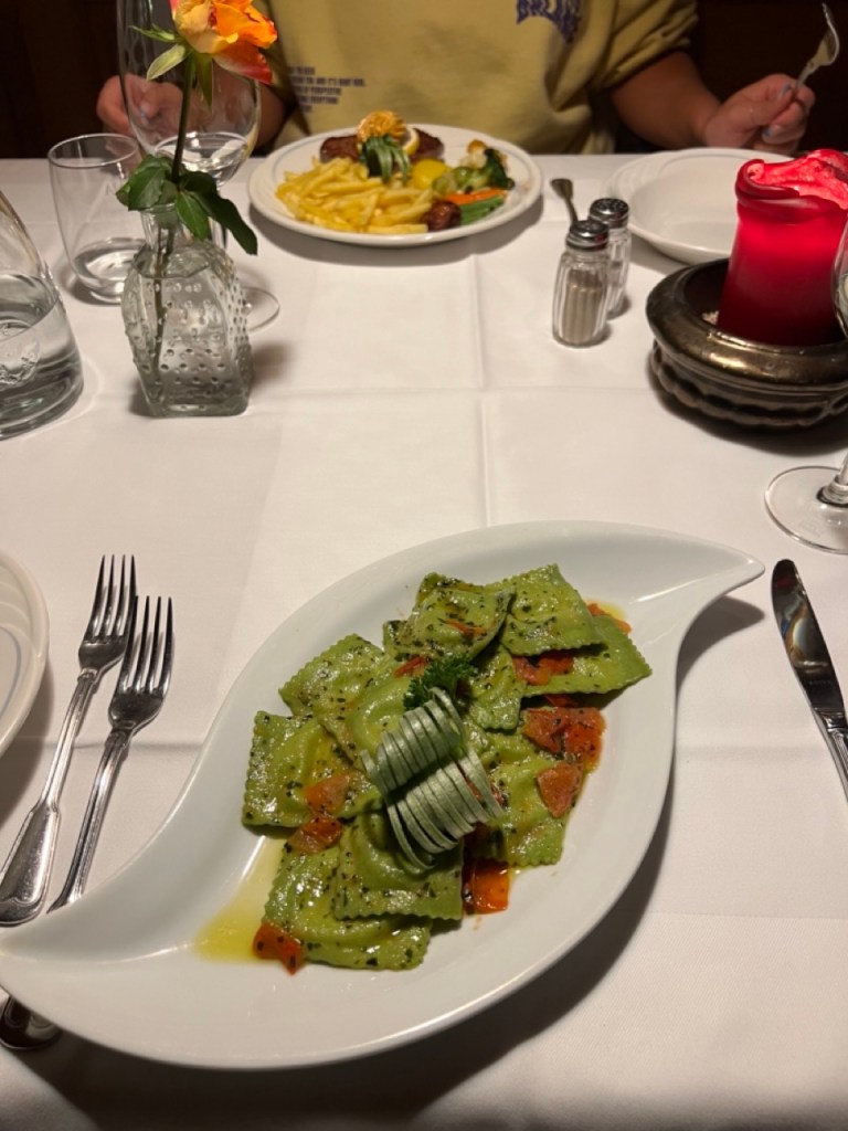 Dinner was delicious – our server was beyond friendly, sharing his plethora of knowledge with his ability to speak 5 different languages. Eva had ravioli and I had a steak, and we both got their creamy vegetable soup – another soup for the win. We also had a signature white wine that was delicious in every way, as well as their dessert. It was a fulfilling, comforting dinner – following with a cozy night in binge watching Survivor (which was a nightly ritual the entire trip until we got caught up to what’s currently aired).